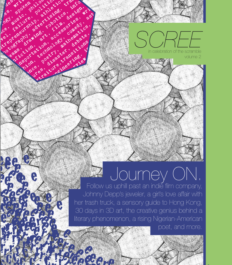It’s here! Scree volume 2 is hot. A Nigerian-American poet, indie film expose, metal band analysis, and a 30 day art experiment are just a few of the features in our second issue. Head right to printing (why not?).