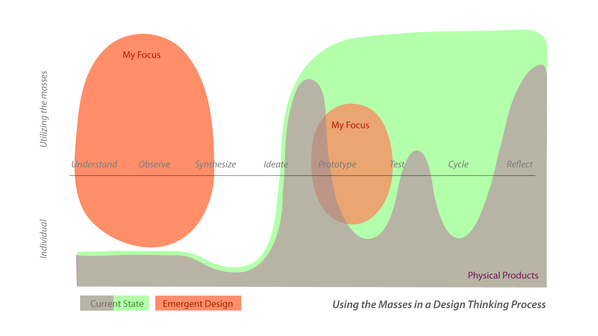 A ‘design thinking’ process with highlighted places where mass numbers of people can be tapped for insight. The focus of my Emergent Design research is shown in the orange areas.